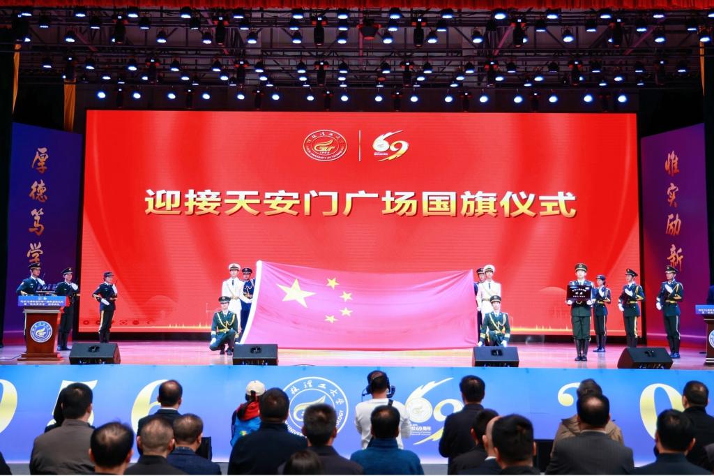 下午15时,典礼在庄严的礼迎天安门广场国旗仪式中正式启幕。全体人员肃立,行注目礼,迎接一面具有特殊意义的国旗入场。这面国旗曾于2024年11月11日——学校建校68周年纪念日当天在天安门广场冉冉升起、迎风飘扬。红旗编号为24-0078,长5米,高3.33米,重1800克,不仅是一件珍贵的实物,更是桂工人家国情怀与使命担当的象征。在铿锵的正步声中,国旗护卫队护送国旗至主席台上展开,全场高唱中华人民共和国国歌,激昂的旋律激荡着每一位桂工人的爱国爱校之心。这面承载共和国辉煌与国家叙事的国旗,将永久珍藏学校,成为一代代桂工人牢记嘱托、接续奋斗的精神财富。