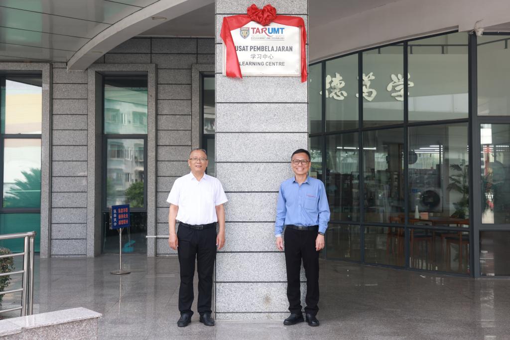 学校校长王敦球(左)、拉曼理工大学校长拿督英特拉李仕伟(右)共同为“拉曼理工大学学习中心”揭牌